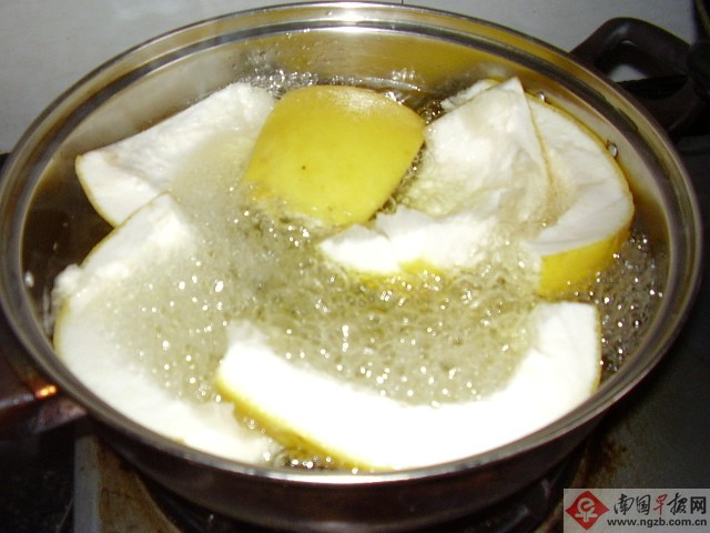2。水開后關(guān)火,不能煮久,煮久柚子皮爛了口感不好。柚子皮泡在開水里大概半個(gè)小時(shí),把柚子皮的水?dāng)D干